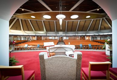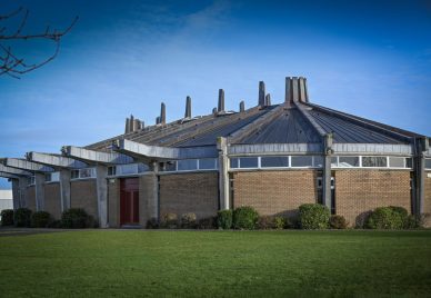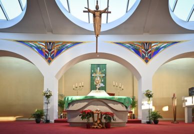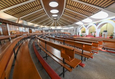 The Church is of a unique architectural style, oval in shape. The image which inspired its design is the Old Testament moving Tent, which contained the Ark of the Covenant during the period after the Exodus, when the people of Israel wandered through the desert towards the Promised Land. Thus the roof is of a particularly unusual design. The seating arrangement accords with the curvature of the outside walls and slopes towards the sanctuary. The resulting effect is one of greater participation in the liturgy. The baptistery and the tabernacle areas balance each other on either side of the altar area. Thus great prominence is visually given to the two Sacraments (Baptism and Eucharist), through which members are initiated into the family of the Church.